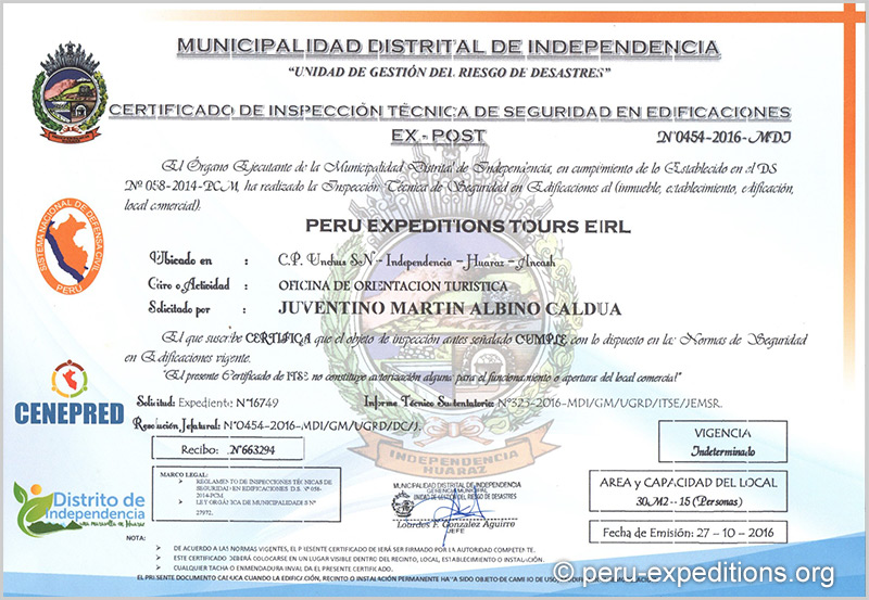 Having so much experience to rely on, his son, Juventino Martin Albino Caldua, who has followed his father footsteps in to tourism, started guiding in 1980 and studied 3 years at the “Peruvian School of Mountain Guides - Casa de Guias CEAM - Centro de Estudios de Alta Montaña” Formed under a bilateral agreement called the ‘’ Alps - Andes Project ‘’ between Switzerland and Peru, Its objectives are to form professional guides (School of mountain Guides) to be an official mountain guide the AGMP ‘’Asociación de Guías de Montaña del Perú’’ belongs to the UIAMG (Asociación Internacional de Guías de Montaña de todo el Mundo) which ensures dedicated, professional service.