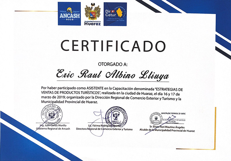 Eric at the moment he is a member of AGOMP (Asociación de Guías Oficiales de Montaña del Perú) as a Professional Mountain Guide.
